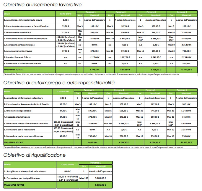 - Obiettivo di riqualificazione (per il percorso 5).Le tabelle che seguono riportano per ciascun percorso di politica attiva i massimali dispesa ammessi.
